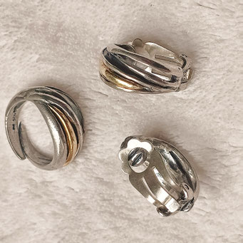 Modernist Perli, 925 Silber/585 Gold: verstellbarer Ring mit Ohrklipsen