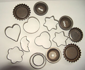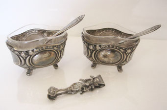 2 Salieren/Senftöpfchen, Kraftalpacca, mit Löffeln u. Glaseinsatz + 1 Zange