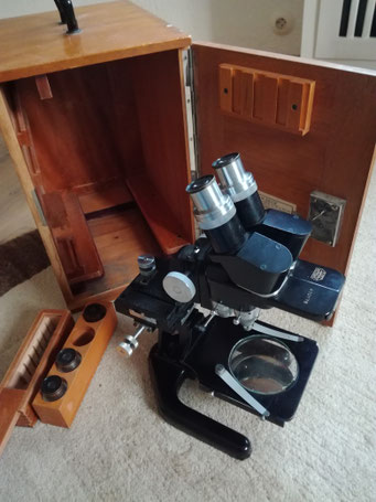 Stereo-Mikroskop binokular in Holzkiste mit etwas Zubehör, 50er Jahre