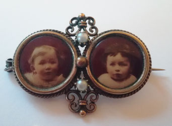 antike Brosche mit 2 Kinder-Portraits, vergoldet, 2 Perlen