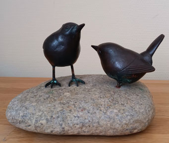 2 Zaunkönige, (Kupfer) auf Urgestein, signiert Basche