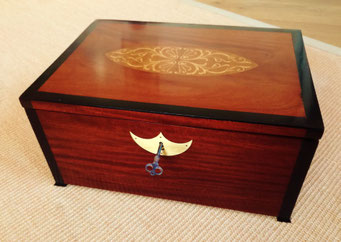 kleine Truhe, Mahagoni/Ebenholz, Intarsien, Messingbeschläge